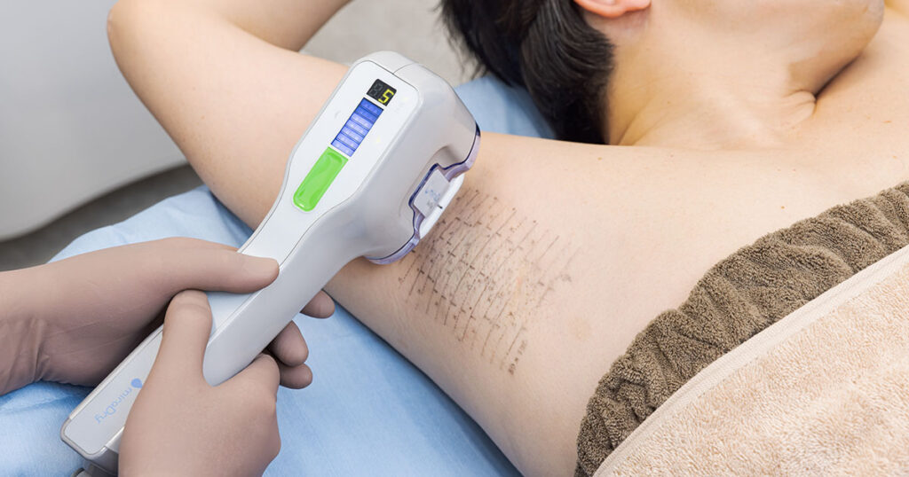 ミラドライはワキの汗の原因となるエクリン汗腺、臭いの原因となるアポクリン汗腺にマイクロ波(電磁波)を照射し、汗腺に熱ダメージを与えます。なので術後のワキは軽くやけどを負った状態になります。簡単に言うとひどい日焼けをした後のような状態です。
